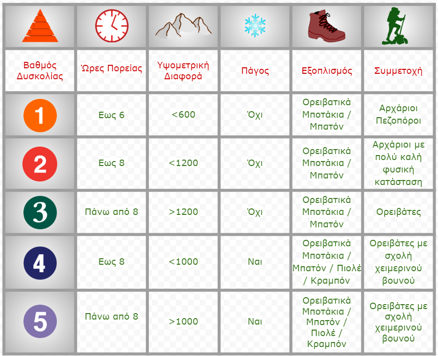Ο βαθμός δυσκολίας λαμβάνει υπ’ όψιν την περίοδο που θα πραγματοποιηθεί η διαδρομή (καλοκαίρι- χειμώνας).
